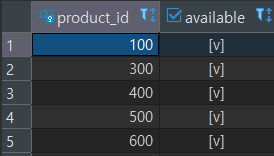 둘째, 일부 샘플 데이터를 stock_availability 테이블에 삽입합니다. 우리는 부울 값에 다양한 리터럴 값을 사용합니다.