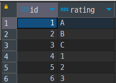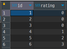 먼저 id 및 rating의 두 개의 열로 구성된 ratings 테이블을 작성합니다. rating 열의 데이터 유형은 VARCHAR(1)입니다: