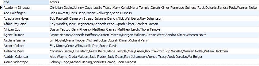 이 예에서는 STRING_AGG() 함수를 사용하여 필름 테이블에서 각 필름의 배우 이름 목록을 반환합니다: