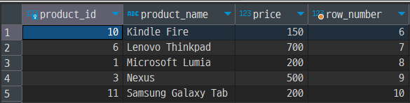 ORDER BY 절은 결과 집합을 product_id로 정렬하므로 ROW_NUMBER() 함수는 product_id 순서에 따라 행에 정수 값을 할당합니다.