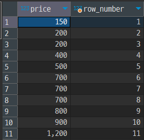 또는 FROM 절의 하위 쿼리를 사용하여 고유 가격 목록을 얻은 다음 외부 쿼리에 ROW_NUMBER() 함수를 적용할 수 있습니다. 이렇게 해서 원하는 결과를 얻을 수 있습니다.