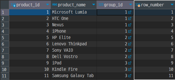 다음 쿼리에서는 PARTITION BY 절을 사용하여 group_id 열의 값을 기준으로 창을 부분 집합으로 나눕니다. 이 경우 ROW_NUMBER() 함수는 각 파티션의 시작 행에 하나를 할당하고 동일한 파티션 내의 다음 행에 대해 하나씩 증가합니다.
