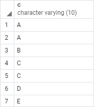 VALUES('A'), ('A'), ('B'), ('C'), ('C'), ('D'), ('E');