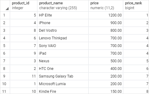 DENSE_RANK() 함수는 ORDER BY 절에서 지정한 높은 가격 순서에서 낮은 가격 순서를 기준으로 각 제품에 순위를 할당했습니다.