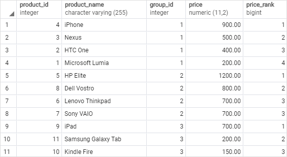 이 예에서 PARTITION BY 절은 제품을 제품 그룹으로 배포했습니다. ORDER BY 절은 DENSE_RANK() 함수가 적용되는 각 그룹의 제품을 높은 가격에서 낮은 가격으로 정렬합니다.