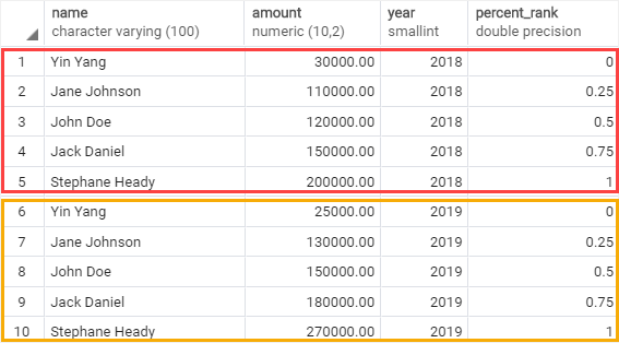 이 예제는 2018년과 2019년 모두 영업 사원의 매출액 백분위수를 계산하기 위해 PERCENT_RANK() 함수를 사용합니다.