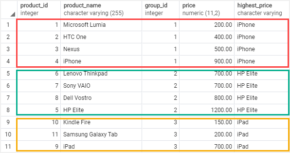 - ORDER BY 절은 각 제품 그룹(또는 파티션)의 제품을 낮음에서 높음으로 정렬했습니다.