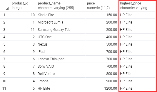 1) 결과 집합 예제에 PostgreSQL LAST_VALUE() 사용