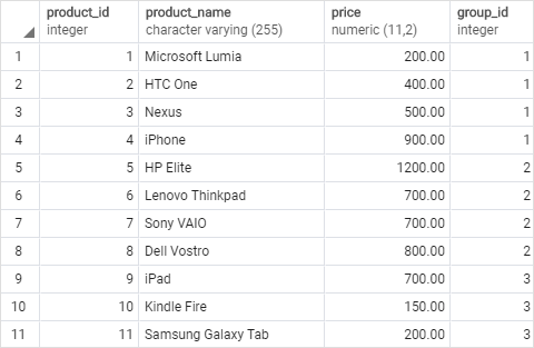 window function 튜토리얼에서 작성한 products table를 시연에 사용합니다: