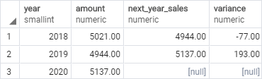 - 그런 다음 외부 쿼리는 LED() 함수를 사용하여 각 행에 대한 다음 연도의 매출을 반환합니다.